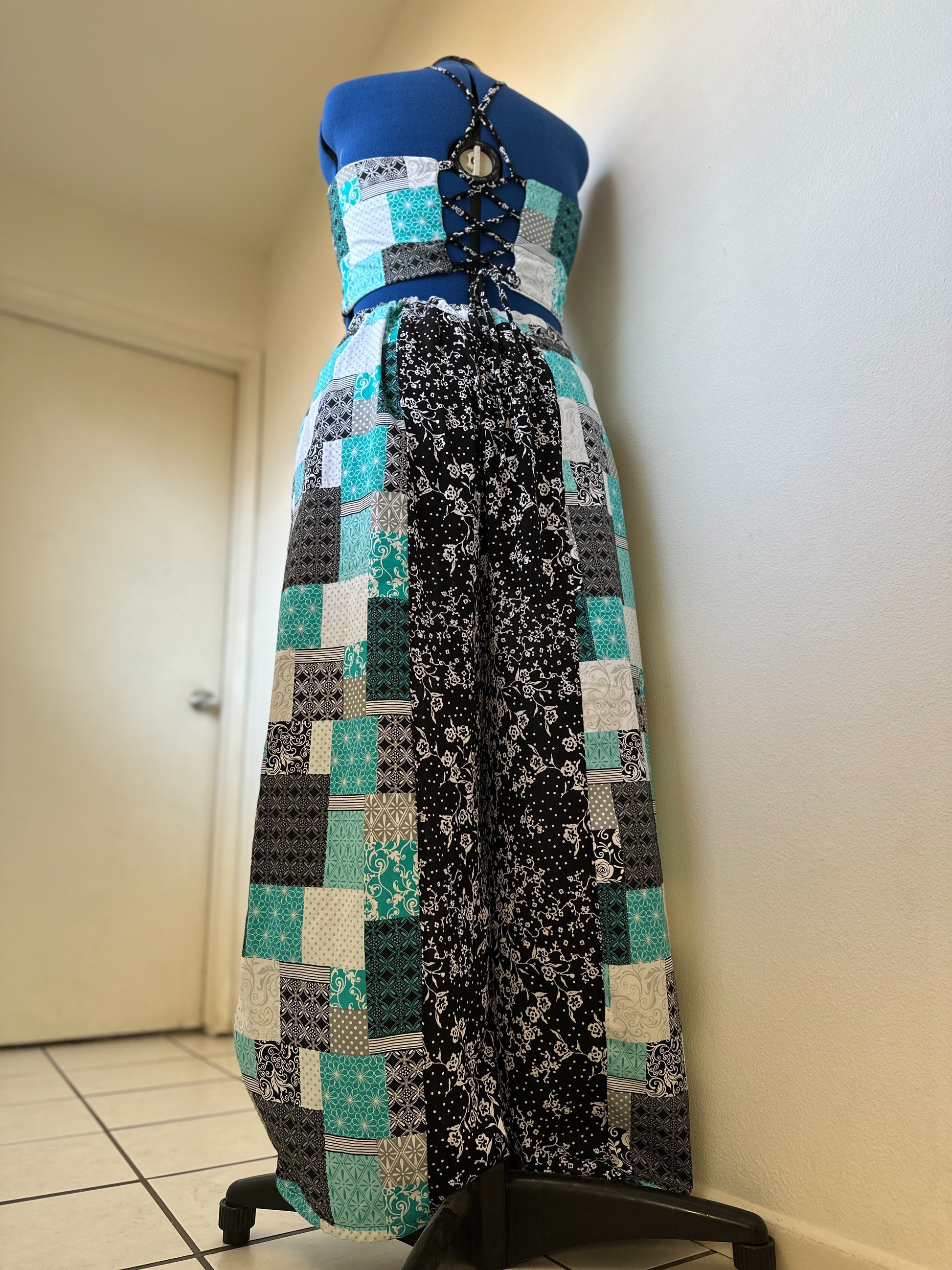 - This Listing: Petite XXL made in matching black, white, and teal cotton fabric.