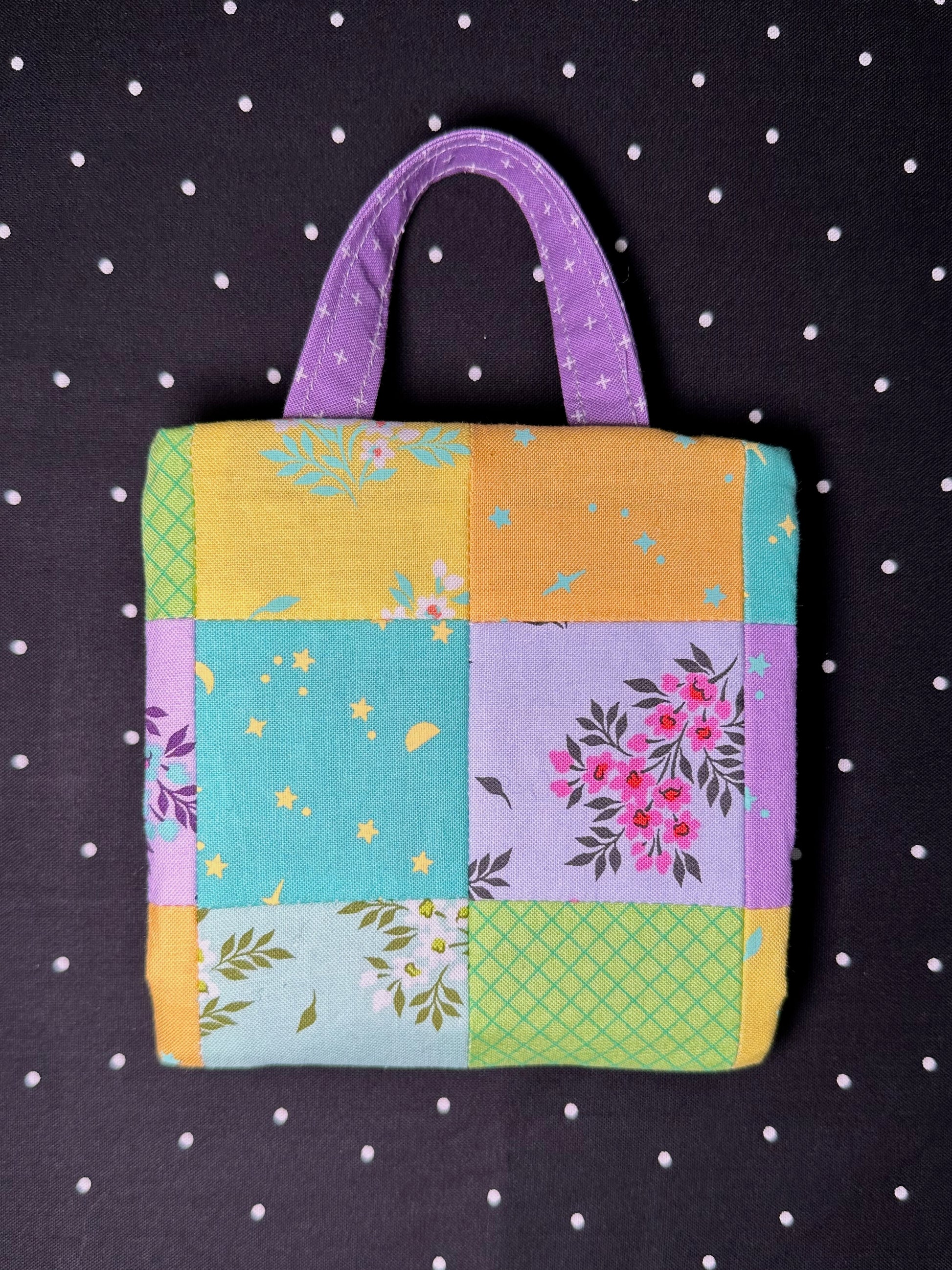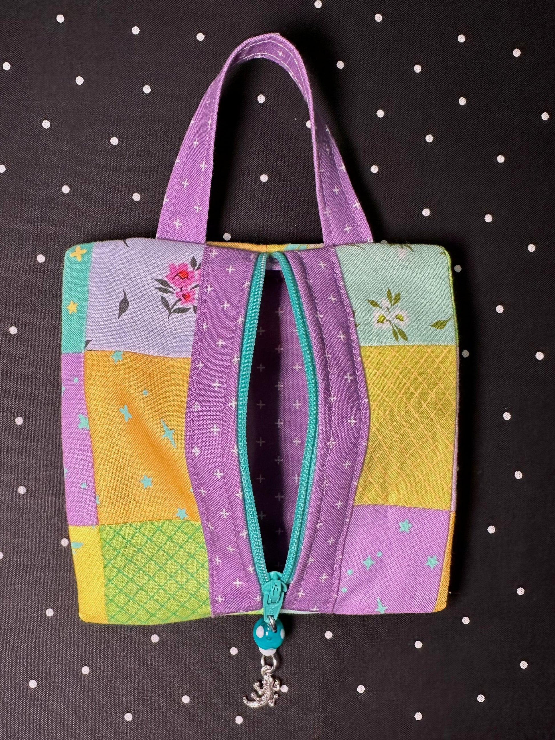 - This Listing: Small 5" × 4" patchwork bag with handle and zipper, finished with a matching handmade charm.